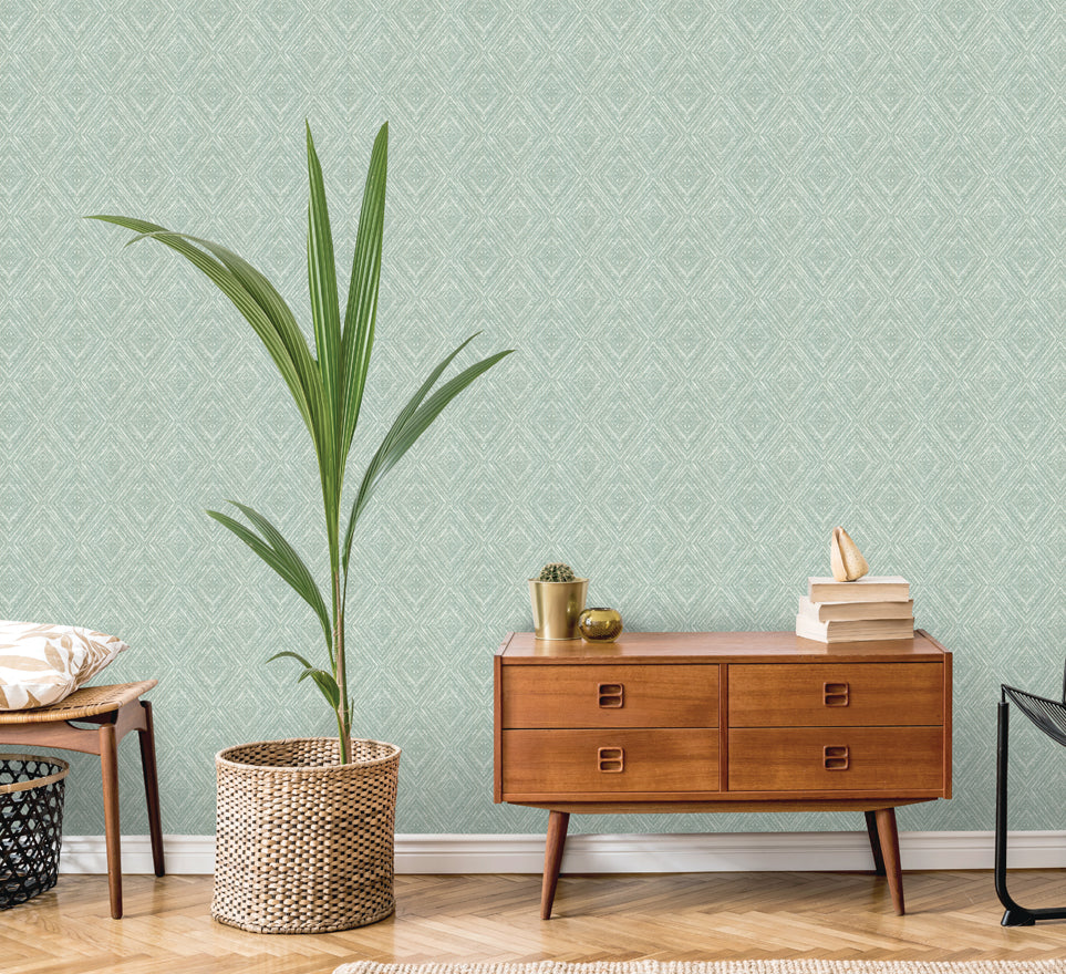 Imani is an aztec diamond patterned wallcovering. It features a chalky matte white printed pattern on top of a weave effect acrylic textured background. This design has a raised acrylic finish and the colourway is soft teal with white chalky highlights. This product is paste-the-wall, PVC-free and uses water based ink.