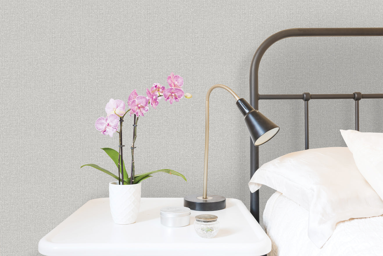 Imani texture is a realistic weave-textured wallcovering. It features matt and metallic background slubs underneath a raised acrylic natural texture to give a genuine woven look. This colourway is grey with silver metallic highlights. This product is paste-the-wall, PVC-free and uses water based ink.